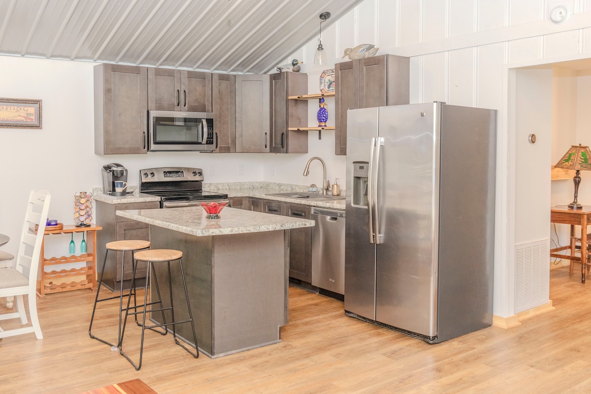 ADMITIDOS ANIMALES. Retiro frente al mar cerca de toda la comida y diversión que ofrece el lago KY. La casa tiene una suite principal con bañera, así como una ducha con cabezal tipo lluvia. Cocina totalmente equipada con todo lo que necesitas para preparar una comida, beber o abrir una botella de vino o cerveza fría. Sala de estar de concepto abierto con TV inteligente, wifi y sofá cama tamaño queen. Solárium para ver el agua y terraza con zona de parrilla cubierta para relajarse después de un día en el lago o disfrutar de la hoguera mientras se contempla la puesta de sol. ¡También incluye 4 kayaks para uso de los huéspedes!