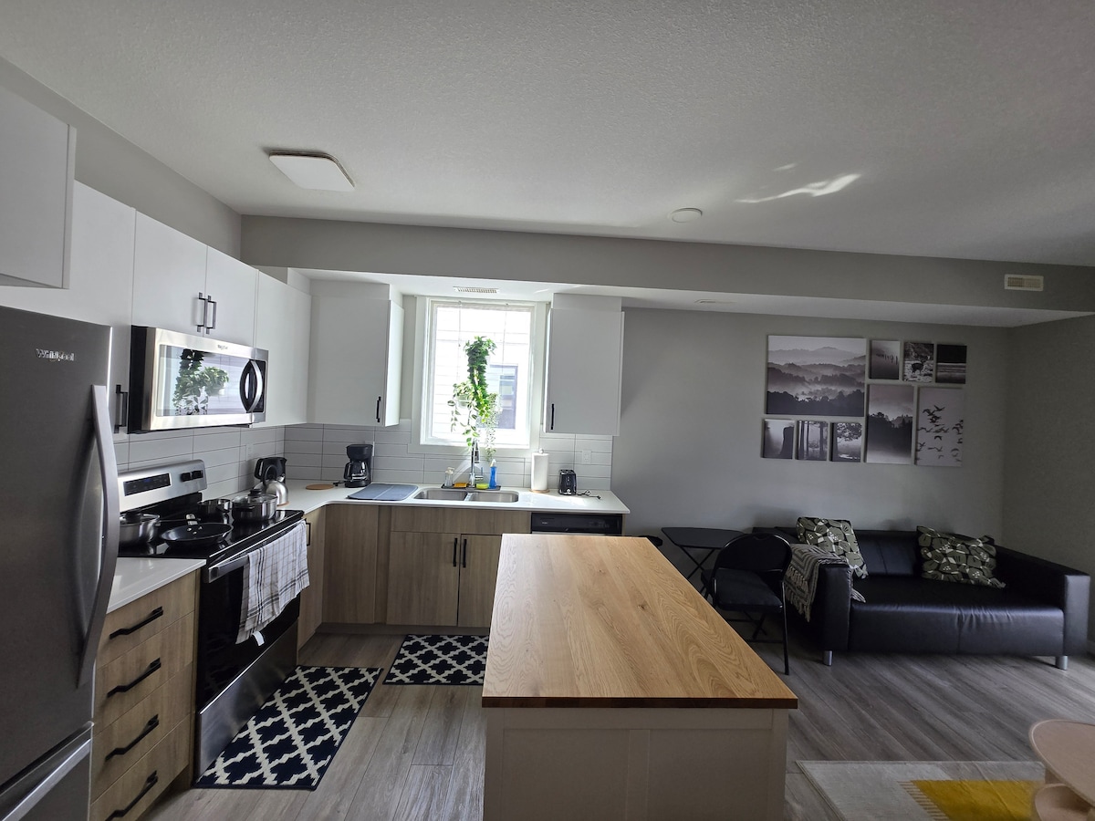 Acogedora suite en el sótano en un barrio tranquilo y seguro en West Edmonton, a 8 minutos en coche del centro comercial West Edmonton Mall, a 3 minutos en coche del River Cree Resort & Casino y de Costco. La suite está equipada con el máximo aislamiento acústico para la comodidad de los huéspedes. La cocina completa con encimeras de cuarzo está totalmente equipada. El dormitorio viene con una cama tamaño queen. Hay un sofá cama plegable que también es de tamaño individual/doble. Hay estacionamiento en la calle disponible para los huéspedes. Es una instalación para no mascotas y para no fumadores.