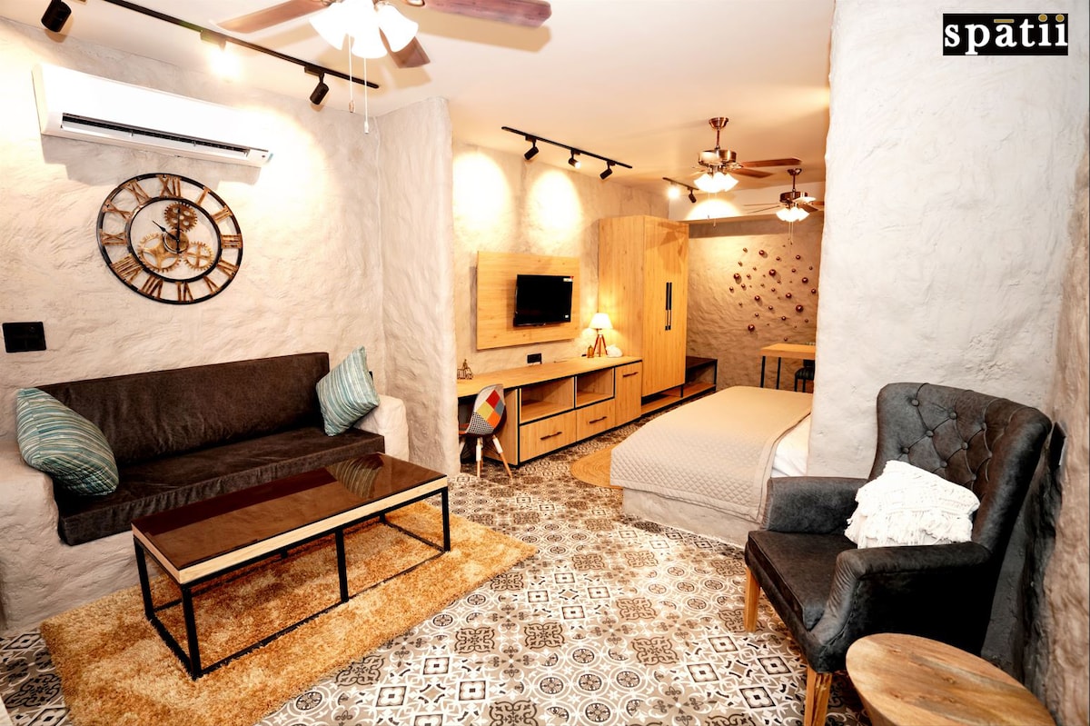 Maitri (मैत्री) representa la amistad, la comodidad y una sensación de facilidad. • Ubicado en una zona tranquila pero céntrica de la ciudad, este estudio cuidadosamente planificado es luminoso, limpio y cómodo. • Las ventanas grandes dejan entrar la luz natural y el diseño sencillo y despejado mantiene el espacio relajado. • Ideal para parejas, viajeros solos o estancias de trabajo, ofrece privacidad y tranquilidad sin sentirse aislado. Maitri está destinado a reducir la velocidad, instalarse y disfrutar de una estancia tranquila en la ciudad.