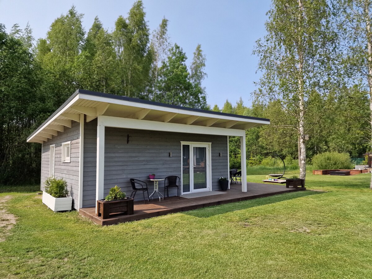 A freshly renewed tiny house on the banks of the Sauga River is waiting for you! Private, cozy, and blue – it has everything you need for a relaxing getaway or a practical stopover: -Comfortable tinyspace for up to 4 guests -Kitchen, shower, and a fireplace -Parking for multiple cars -Dog-friendly!