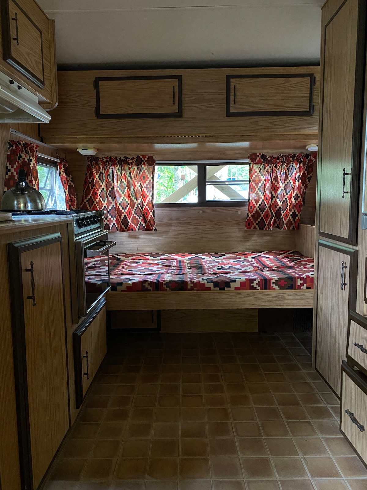 Nuestro remolque sin conexión a la red eléctrica ofrece un hogar lejos de casa. Este remolque está totalmente equipado con todo lo necesario para una experiencia de acampada acogedora y cómoda. El alquiler incluye una barbacoa y una estufa de dos quemadores, que ofrecen opciones para cocinar al aire libre. Suministramos todos los platos y utensilios de cocina necesarios. El remolque tiene capacidad para 6 personas. Las opciones para dormir incluyen una cama tamaño queen, un juego de literas y un sofá cama doble. El remolque también cuenta con una nevera que funciona.
