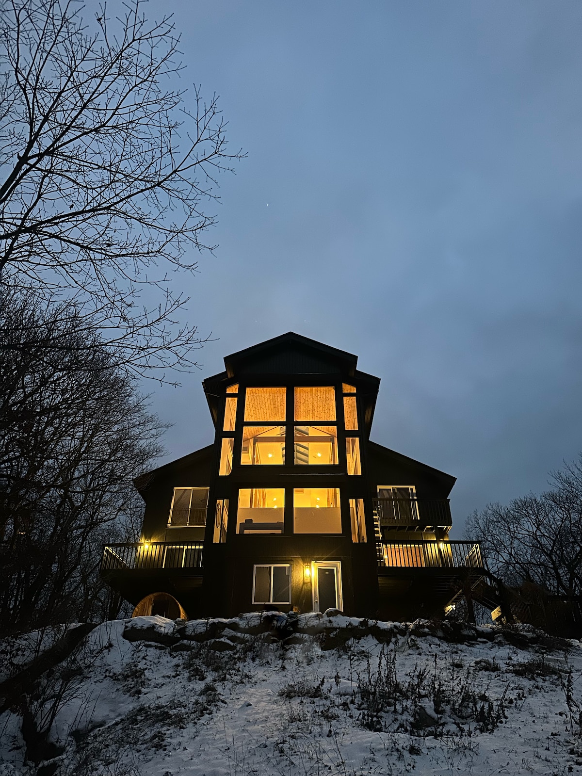 Quiet Private lakehouse set down on 2 rare rock bluffs giving you a majestic water view just like it was in 1939. Extra Lg Great room w a huge fireplace. The great kitchen surrounds the chef. Big hot tub, Rowboat with canopy, 8 kayaks, Treehouse, Neverending Lakeside windows, docks, 1 hr from Manhattan w Eagles & vast wildlife like you were in the deep woods. Clean, unspoiled lake full of fish. Never had gas motors. A Mountaintop lake above the ski area. Stargazing! Perfect for get-togethers.