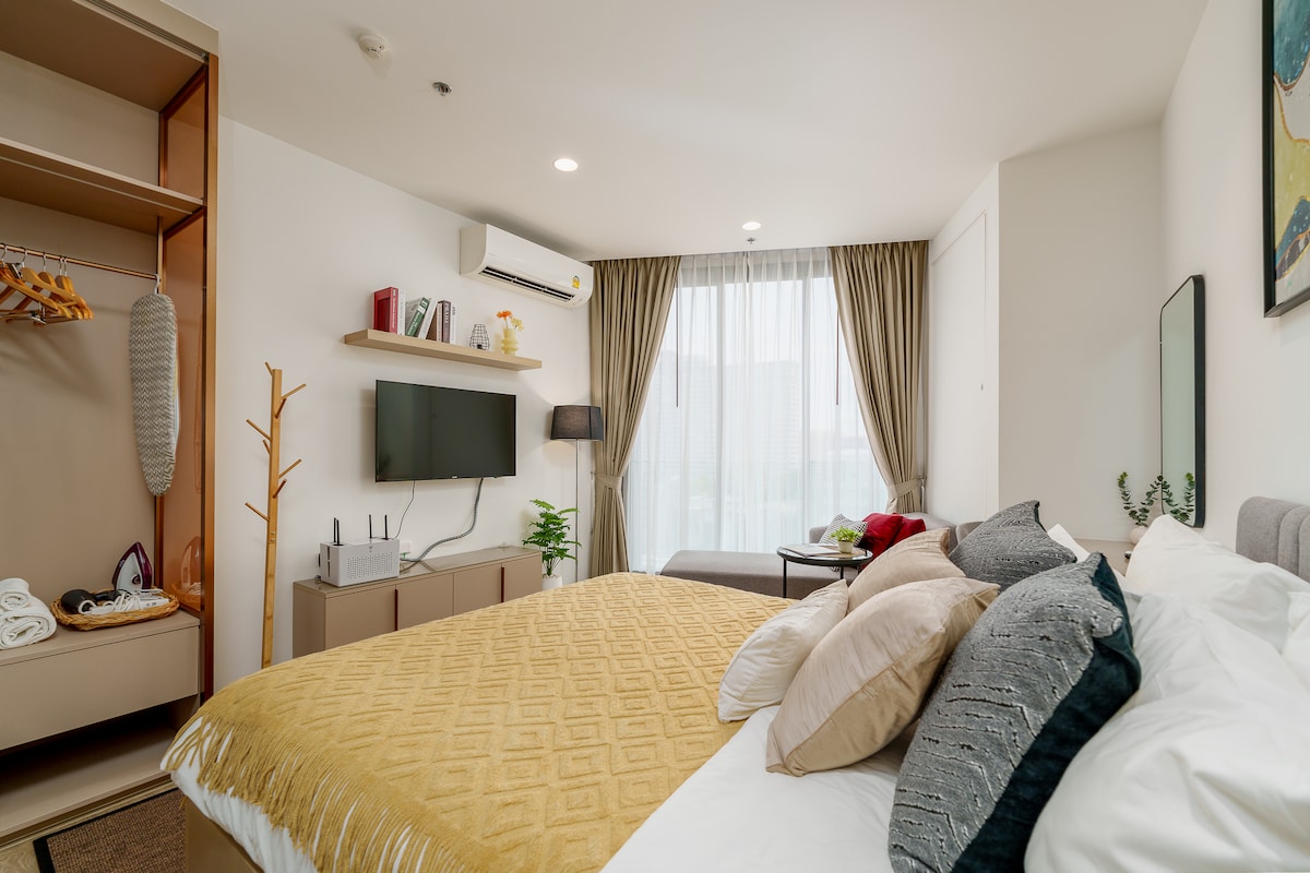 Este apartamento con vistas al mar se encuentra en el corazón de Pattaya, a pocos pasos de la playa. Walking Street, el muelle y los centros comerciales Central están a poca distancia. La piscina infinita de la planta 31 ofrece vistas panorámicas de Pattaya, donde el horizonte se funde con el espectáculo dorado de la puesta de sol. En el interior, la elegante decoración tropical combina el encanto vintage con el confort moderno, con un colchón Sealy tamaño king para un sueño de primera calidad. La base perfecta para los viajeros más exigentes, con café Nespresso para empezar bien el día.