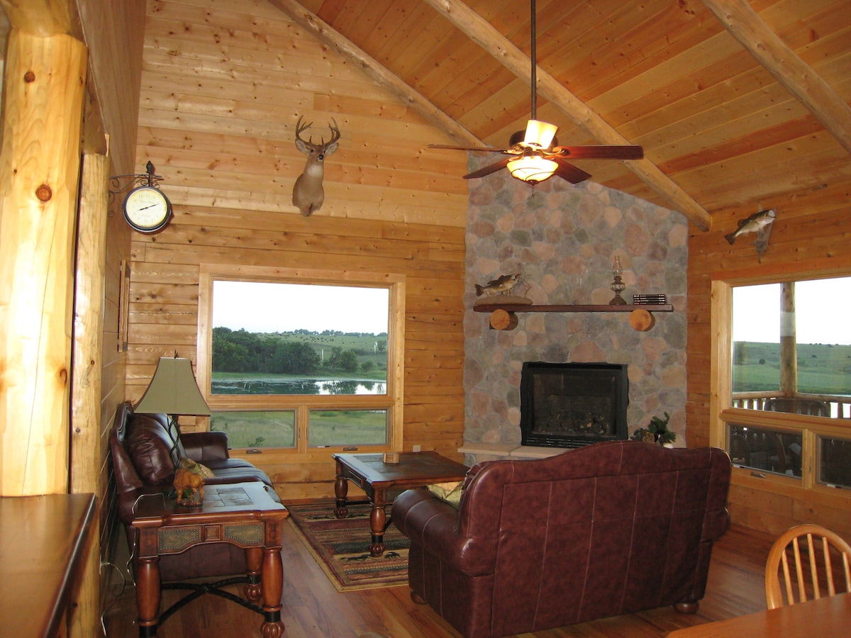 The lodge features two full PRIVATE suites, each accommodating up to six guests. Each suite includes: - A queen bedroom with a cedar log bed. - A bunk bedroom with two sets of extra-long twin, rustic Aspen bunk beds. - A full size bathroom. - A fully equipped kitchen for preparing meals, plus 2 outdoor charcoal grills. - A great room with vaulted ceilings, log beams, a floor-to-ceiling stone fireplace, leather sofas, dining room, and large picture windows showcasing stunning views.