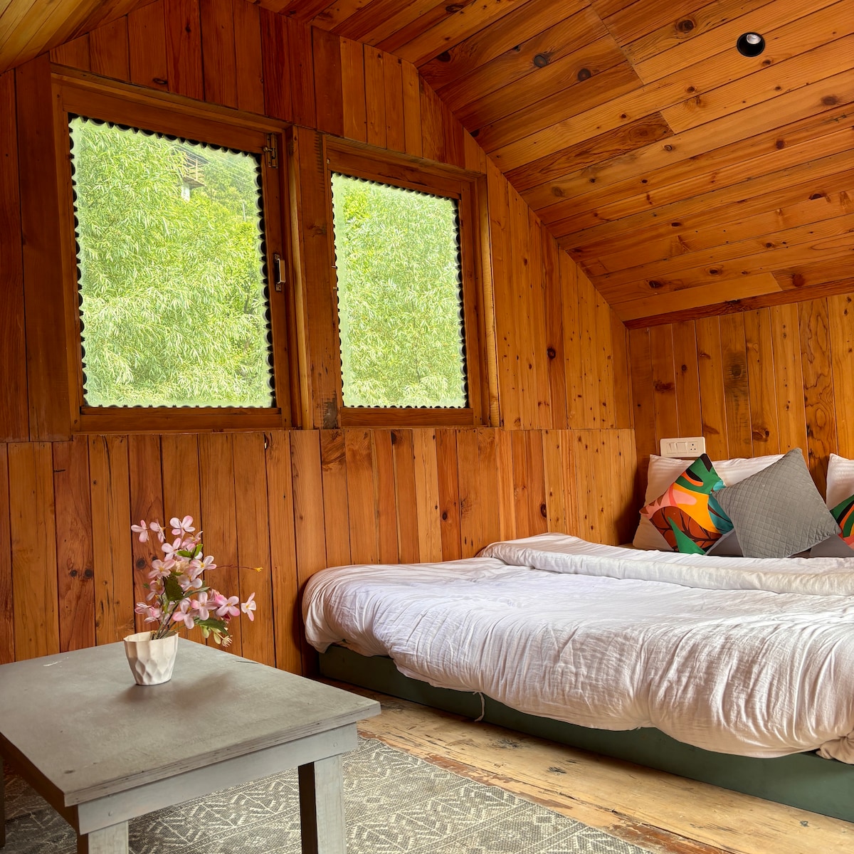 This is the room for people who want to work, wander and wake up to the mountains. A sun-drenched king room with floor-to-ceiling windows, a wrap-around mountain view balcony and a dedicated work desk make it perfect for digital nomads and couples who refuse to choose between comfort and adventure. Sit on the balcony with a tea maker brew and watch clouds drift over the Jibhi valley. Includes wifi, hot water, quality linens, free toiletries and a bustling inhouse cafe just downstairs.