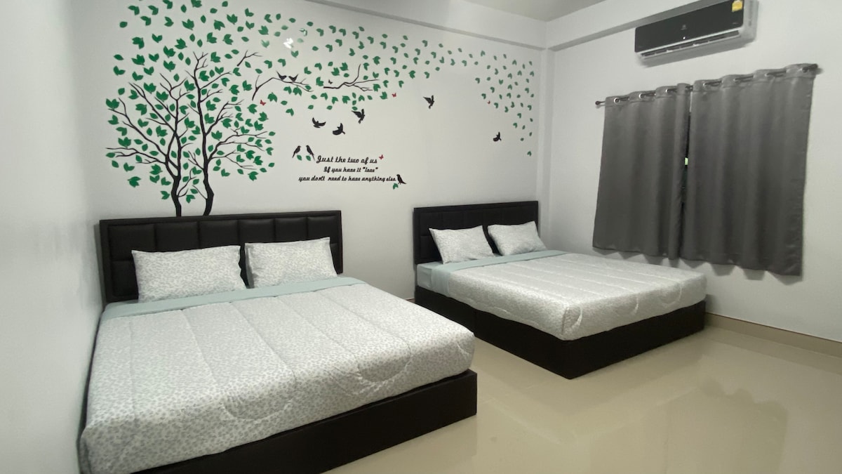 Siéntete como en casa es la mejor casa de huéspedes de la ciudad de Betong. Tenemos 2 habitaciones en la casa de huéspedes. Cada habitación tiene 1 cama tamaño queen con cama corrediza de 3,5 pies para una familia de cuatro personas seis. Cada habitación tiene aire acondicionado. Nuestra cocina tiene microondas, olla caliente, nevera y café gratis, milo. La sala de estar tiene TV inteligente, sofá, mesa de comedor para unir tu tiempo, aparcamiento privado gratuito en la casa de huéspedes.