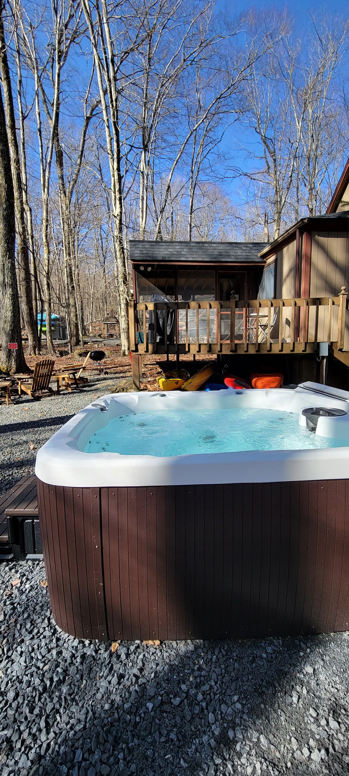 Escápate a SantiCabin, un refugio de lujo en los bosques de Pocono. Disfruta de una bañera de hidromasaje privada, sauna de barril al aire libre, estufa de leña interior, fogata al aire libre, cine en casa 4K y sala de juegos. A minutos de la ciudad vacacional de Jim Thorpe, el pintoresco viaje en tren, los senderos y los mejores centros de esquí. Una escapada de invierno tranquila para parejas, familias y grupos pequeños. Relájate, recarga energías y disfruta de la magia de una escapada tranquila en la nieve. • Big Boulder: 15 minutos. • Jack Frost: 18 minutos • Blue Mountain - 28 minutos