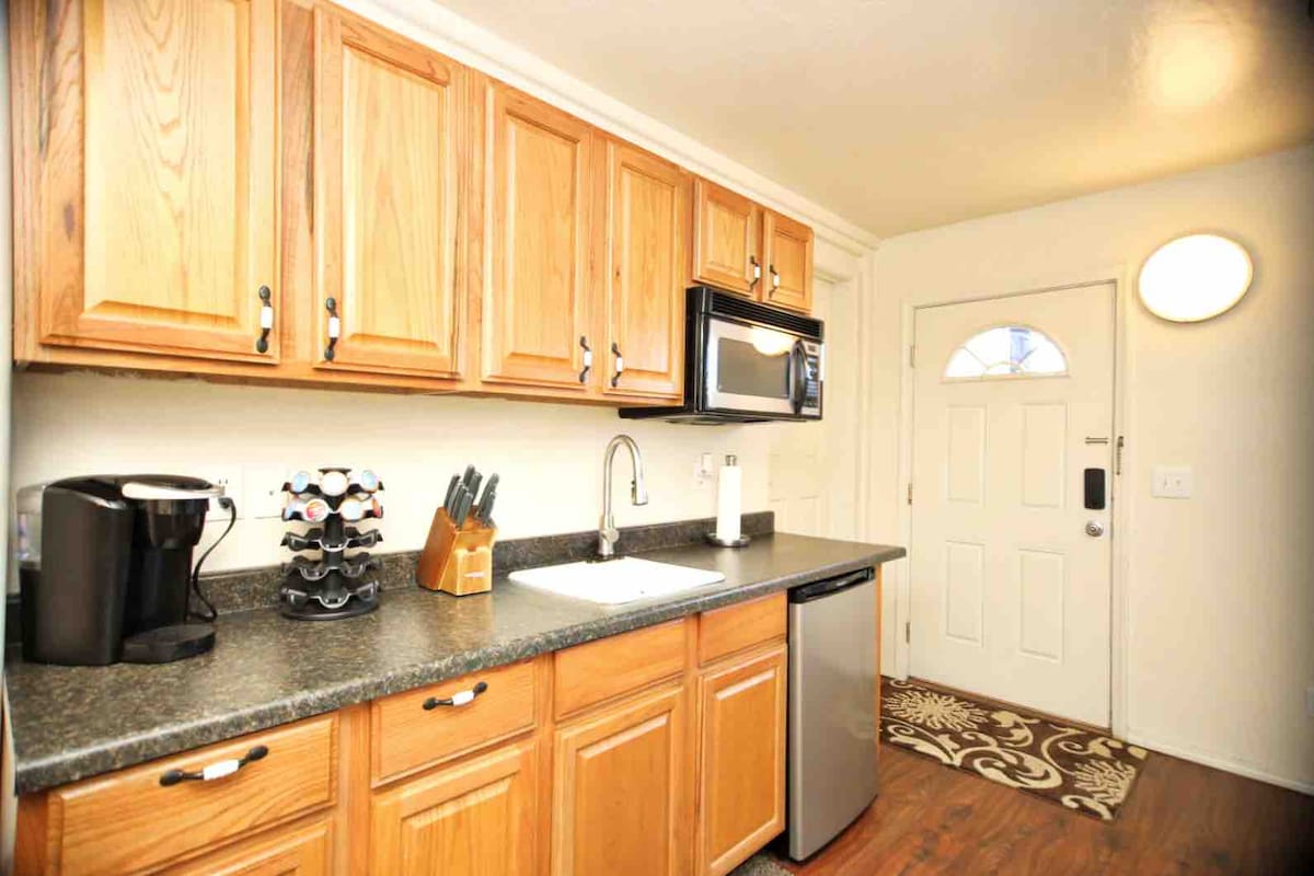 ¡Este estudio limpio, desinfectado y moderno es perfecto para todo tipo de viajeros! Precauciones contra el Covid19. Con una cama tamaño queen que se reclina, puedes dormir lo que necesitas después de un día de aventura. La cocina pequeña es grande y ofrece servicios de cocina y un hermoso rincón para disfrutar de comer/trabajar/soñar despierto. El baño es único con una bañera/ducha de tamaño completo y servicio completo con D. Un vestidor para todos los amantes de la moda.