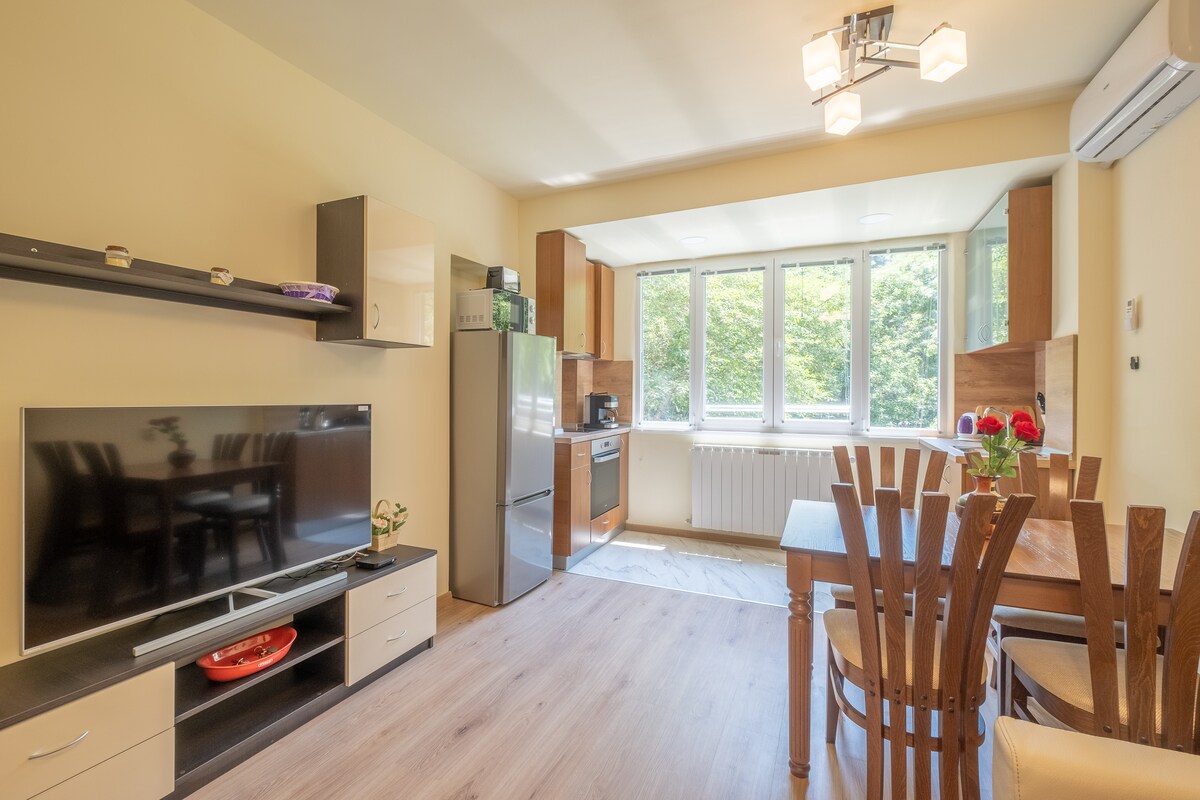 Departamento cómodo y encantador ubicado a 10 minutos del centro. El aeropuerto está a 30 minutos en automóvil. Ubicado en las estribaciones de la montaña Vitosha. Al lado hay un supermercado y un centro comercial. Zona tranquila y segura.