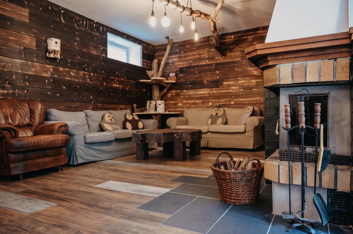 La casa de dos pisos está en un entorno forestal tranquilo. En el nivel inferior, hay una sala de estar con un juego de sofá en esquina que se puede abrir y ofrece oportunidades para dormir para dos personas. La sala de estar se abre a una cocina totalmente equipada. También en la planta baja se encuentra el baño, equipado con inodoro y ducha. En el jardín tenemos un salón cubierto de 30 m2, donde un sofá de jardín para 6 personas y un jacuzzi Wellis Budapest Premium Life para 5 personas intentan servir nuestra relajación.