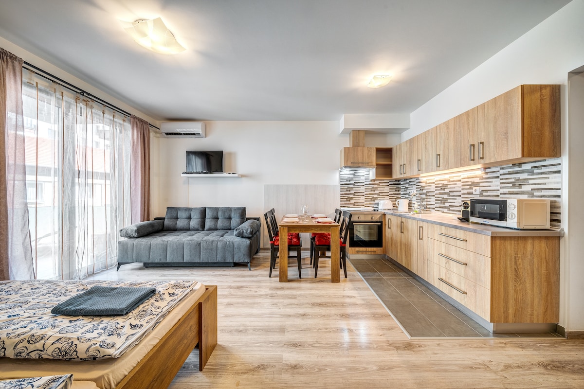 Ambiente fresco y moderno. Amplia sala de estar perfecta para relajarse o trabajar. La cocina está equipada, el baño es lujoso con un baño con ducha doble de vidrio del piso al techo. Alta velocidad Wifi y Netflix. El apartamento está en una zona alegre de Budapest, cerca de atracciones y vida nocturna, pero es una base tranquila. En el moderno distrito de Corvin estamos rodeados de restaurantes, bares, cafeterías, centros comerciales y cine. Se puede llegar fácilmente a las atracciones a pie, metro, tranvía. El aeropuerto está a tu alcance.