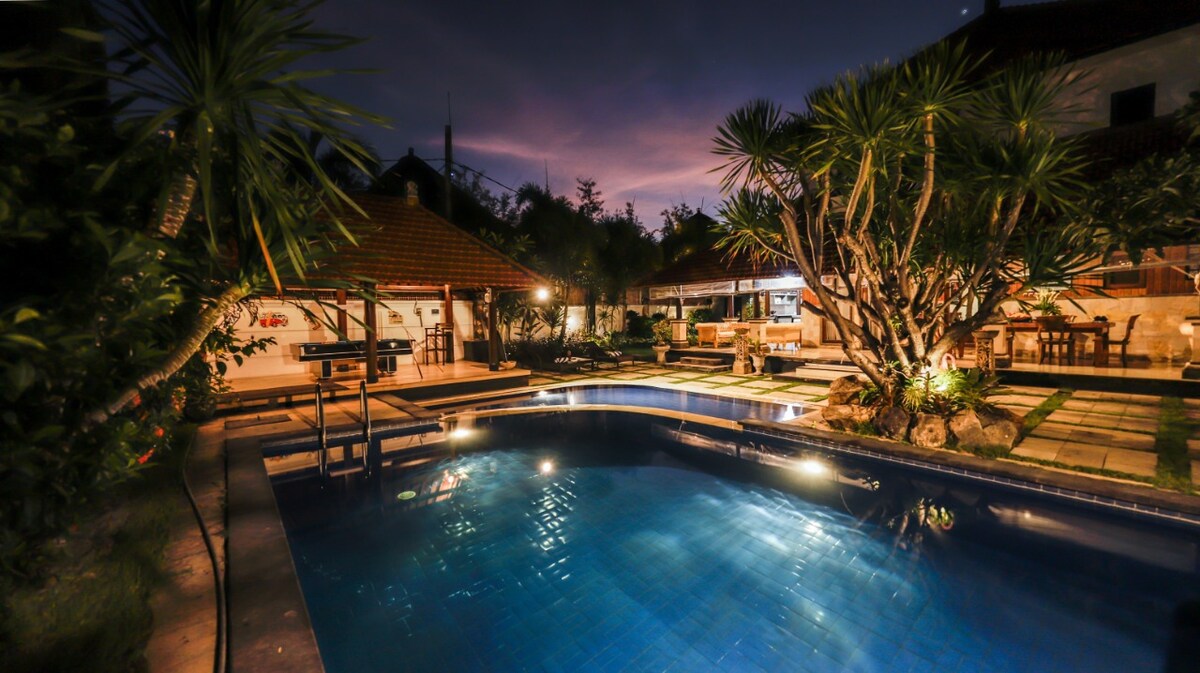 Aprovecha el traslado inclusivo desde el aeropuerto a esta nueva villa con personal y totalmente climatizada. Siéntate a disfrutar de un desayuno preparado todas las mañanas, junto con café Delonghi. Para entretenerte, enciende los 5 televisores inteligentes con Netflix. * Aire acondicionado en todas partes, nuevos sistemas de inversor Daikin. * 3 suites principales: camas tamaño king, televisores inteligentes (canales australianos, AFL, cable y Netflix). * 4º dormitorio con 4 literas individuales tamaño king. * 4 baños privados con toallas, artículos de aseo y secador de pelo. * Buena separación entre las suites principales (todas con cajas de seguridad). * Tomas de corriente universales en toda la villa * 2 reproductores de DVD. Base de sonido BOSE. * Opciones gastronómicas tanto en el interior como en el exterior. * Las literas son individuales tamaño King * Sala de juegos/medios independiente (TV de 55 pulgadas y más de 10 juegos de mesa para niños y adultos). * iPad de Apple para uso de los huéspedes. * Nevera grande y nevera bar * Nueva cafetera Delonghi Espresso * Dispensador de agua fría/caliente * Botellas de agua de vidrio suministradas y rellenadas diariamente de forma gratuita * Enorme cenador/zona de descanso exterior con puntos de energía/USB y ventilador de techo * Amplio garaje cubierto * Cuna x 2, trona x 2. * Valla de seguridad para la piscina disponible y se puede instalar bajo petición de forma gratuita * Barreras de seguridad en las escaleras superiores e inferiores. * Barbacoa (el personal puede prepararla a petición). Toda la villa. Los cuartos del personal se encuentran detrás de la villa, a los que se accede desde el garaje sin molestar a los huéspedes. Tienes el privilegio de tener al Sr. Sukra, la leyenda local, como gerente (y a otro personal) en el sitio todos los días de 8:00 a 16:00 h para prepararte el desayuno y limpiar la villa. También está disponible 24/7 para emergencias (a través del móvil). Sukra también te ayudará con cualquier cosa que necesites, como el cambio de divisas al tipo de cambio más bajo, requisitos de transporte, etc. Es multilingüe. Surfea y haz esnórquel en la playa de Seminyak, a solo 750 metros de esta tranquila y exclusiva ubicación. El centro comercial Seminyak Village está a menos de la mitad de la distancia, mientras que los numerosos bares, cafeterías y restaurantes de Eat Street también están a poca distancia. La villa tiene mucho aparcamiento para un coche y varias motos. Un corto paseo por el carril hasta la carretera principal (Jl Braban) que se encuentra detrás de la calle Eats (Jalan Laksamana) es una opción fácil para llamar a un taxi azul. Una opción más barata y fácil es descargar la aplicación «Grab taxi» y pedir un taxi a la puerta principal de la villa. El Sr. Sukra, el gerente de la villa, estará encantado de ayudarte a organizar cualquier necesidad de transporte. Tenemos una niñera muy fiable, alegre y digna de confianza disponible bajo petición.