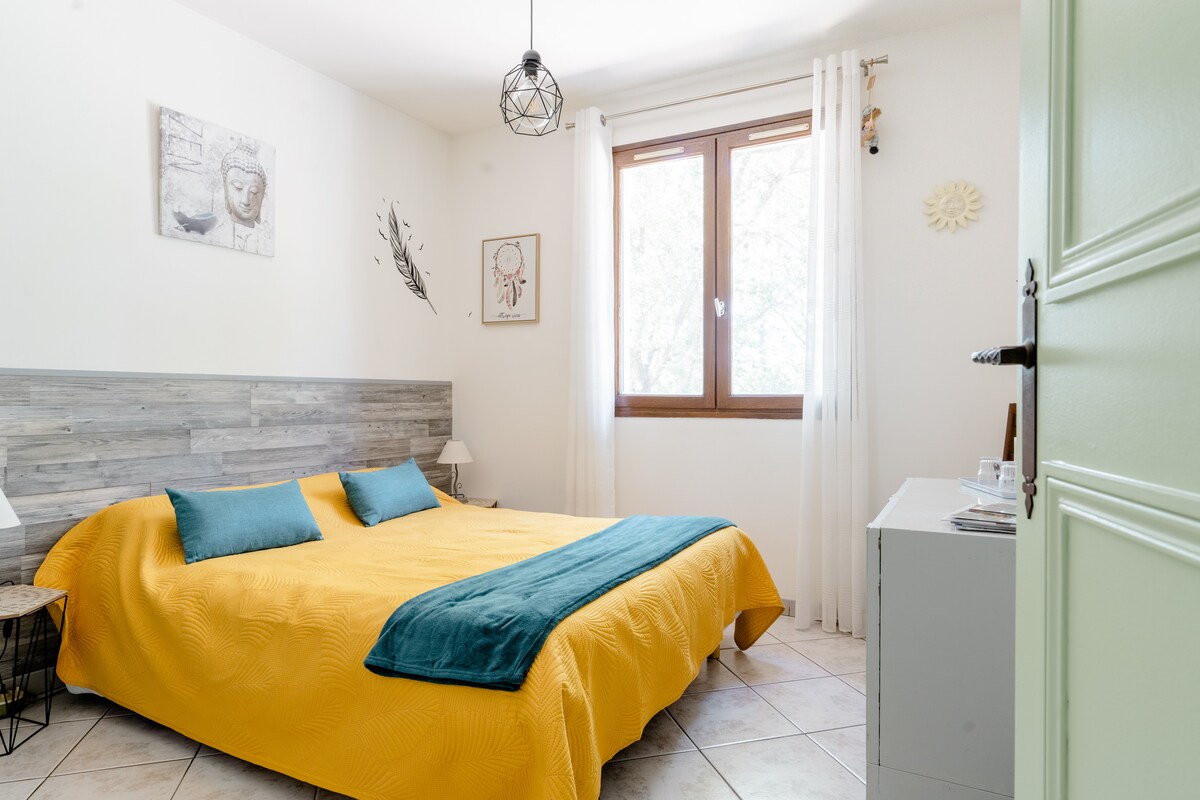 Ensuite bedroom, pool, terrace, gated parking, breakfast, peaceful place! Double room with air conditioning and adjoining bathroom and toilet, TV and Wifi. Terrace and parking, private Garden maintained by us Access to the pool until 9 p.m. (not heated). You will not have access to the interior of the Villa. Breakfast with coffee, orange juice, brioches and baguettes included in the price There will be no ashtrays offered, nor room for pets.