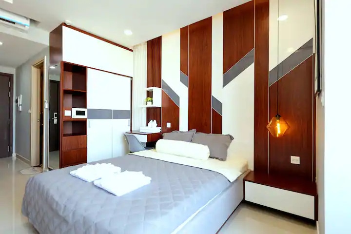 Este alojamiento único está diseñado para disfrutar de una experiencia tranquila. Con una puerta corrediza inteligente, tu sala de estar y tu dormitorio están fácilmente conectados para maximizar la espaciosa casa de 50 m2. Caminando por el puente BaSon entre el condominio y D1, puedes sentir la brisa del río Saigón y las espectaculares vistas de la ciudad. Con solo 5 a 10 minutos en taxi, puedes llegar al centro de la ciudad.