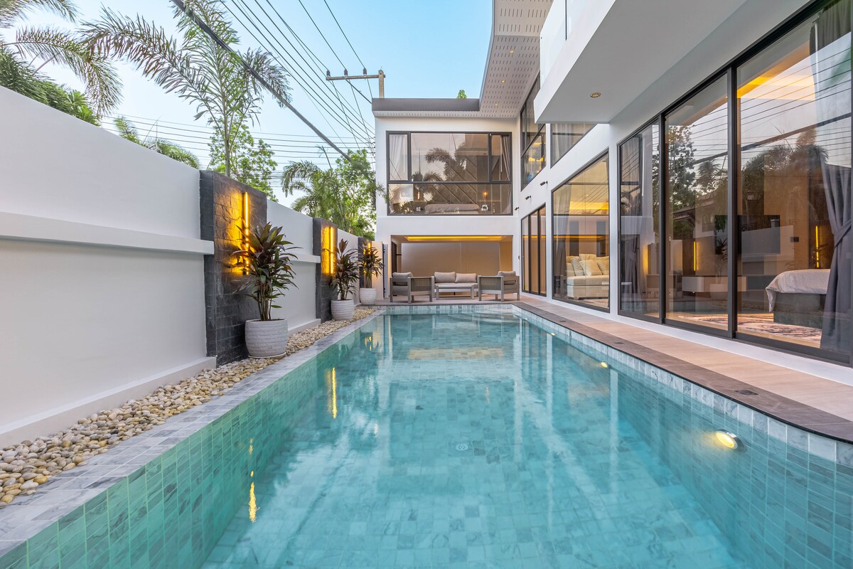 Japanese 4 Bedroom Pool Villa accomodating up to 10 Guests. At the side of the property is a private 4 × 10 meter swimming pool, surrounded by clean stone paving and landscaped gravel areas inspired by traditional Japanese gardens. The villa is ideally located just a 3-minute walk from The Sanctuary of Truth, one of Pattaya’s most famous cultural landmarks. The beach is only 800 meters away, making it easy to enjoy Sunbath.7-11, massage shops,restaurants are all within walking distance.