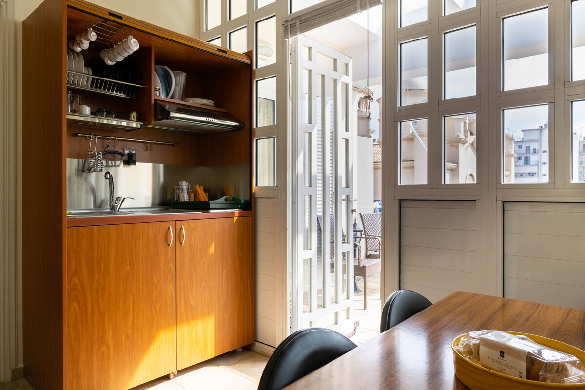 Tranquilo estudio de 14 metros cuadrados en un edificio de apartamentos en el centro de Patras, a solo 40 metros de la Plaza Georgiou y el Teatro Apolo, a solo una cuadra de la calle peatonal Rigas Feraiou. ¡Totalmente renovado, con chimenea y decoración atmosférica! Tiene una ubicación céntrica, a 10-15 minutos a pie de la estación de autobuses interurbanos y a 5 minutos en auto del nuevo puerto de la ciudad. Ideal para una pareja y un profesional.