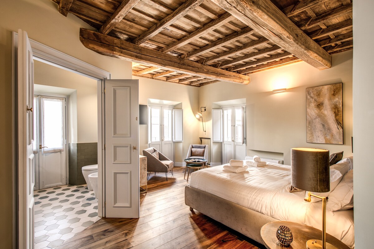 Enciende el gran fuego de piedra y relájate con un libro en esta elegante casa con vistas a Via dei Banchi Nuovi. Los techos artesonados cubren habitaciones acogedoras en tonos relajantes y neutros acentuados por muebles de diseño y pinturas originales del propietario. Esta encantadora casa totalmente renovada se encuentra en una de las zonas más bellas, antiguas y vibrantes del centro de la Ciudad Eterna. También nos gusta ofrecer una hospitalidad ecosostenible: utilizamos electricidad de fuentes renovables y productos orgánicos.
