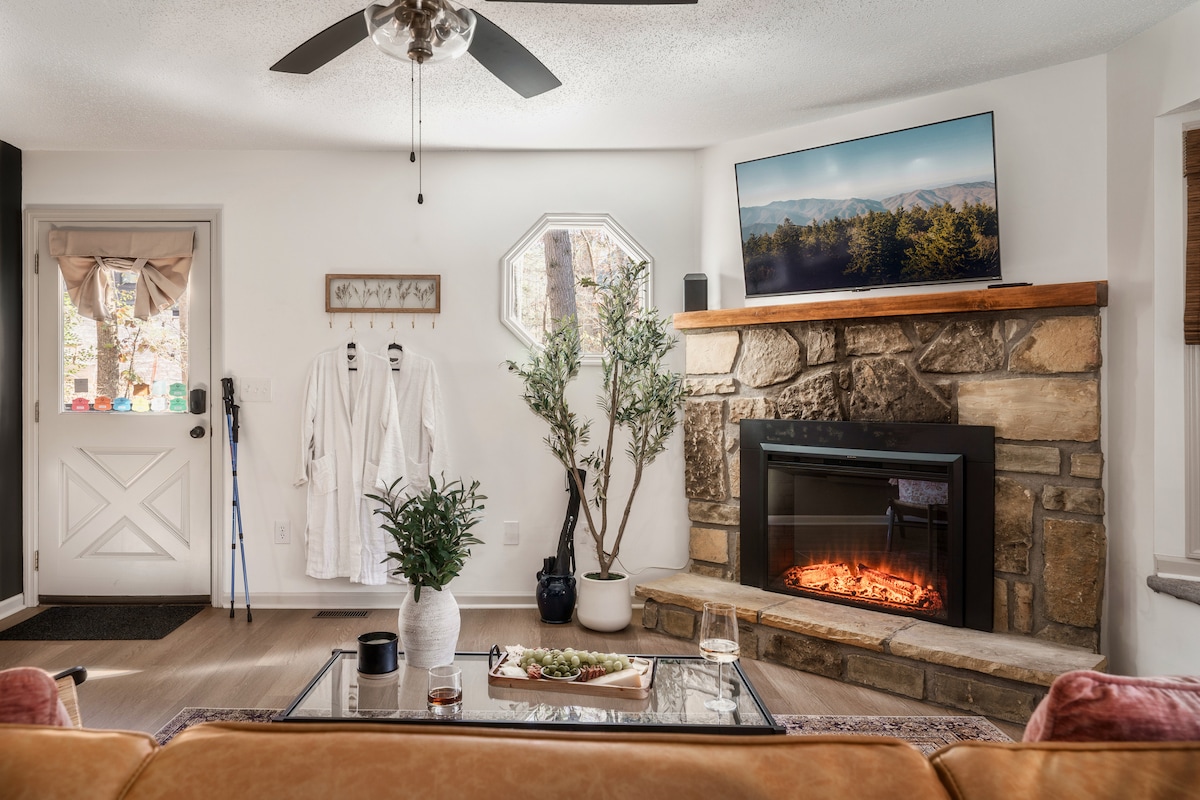 Encaramado sobre una colina privada de 36 acres (¡la más alta fuera del parque!), Belltop es el refugio perfecto. ¡Disfruta de nuestras renovaciones de 2024! Te lo trajo StayBham, creadores de retiros inspirados. Vapor en la amplia sala de vapor. Disfruta del yoga al amanecer en el loft. Sumérgete en el jacuzzi con vistas al valle. Juega a videojuegos vintage. Escucha un disco o toca el piano. Mira la puesta de sol mientras te sientas junto al fuego. A minutos de la entrada de Wears Valley a las Montañas Humeantes.