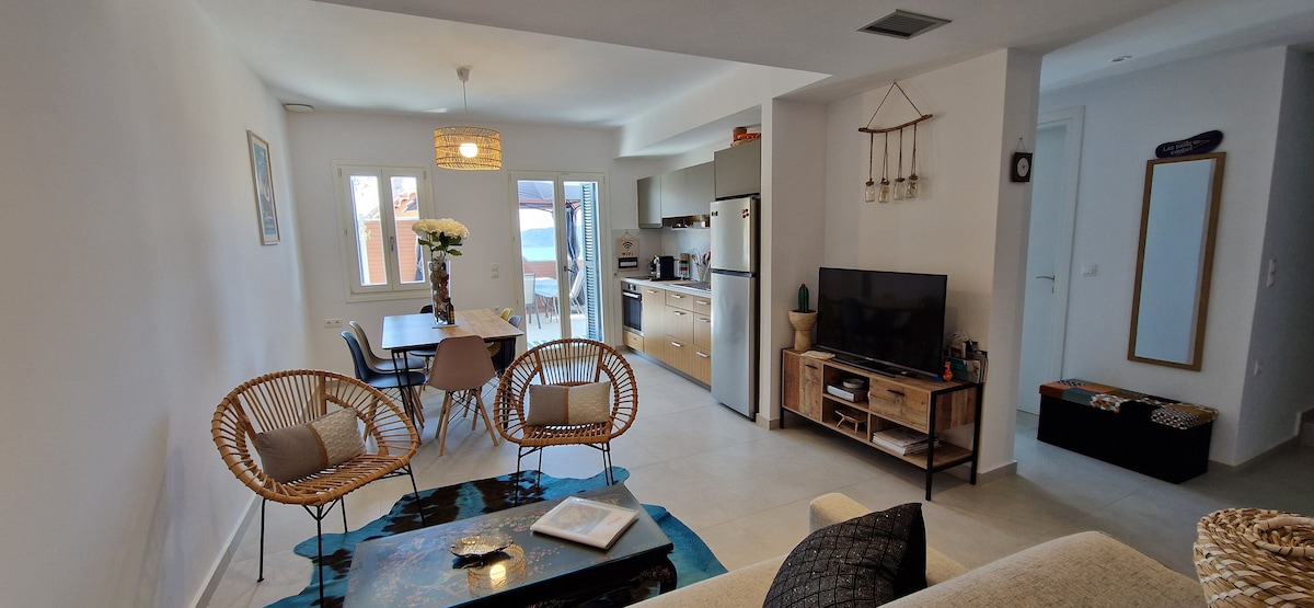 Un apartamento de nueva construcción, con espacios cómodos, un bonito patio con flores y unas vistas fantásticas. Tiene vistas al puerto de Pilos, la laguna de Gialova, la hermosa playa de Voidokilia y el complejo Costa Navarino. Un espacio funcionalmente integrado, muy cuidado, ideal para 3 personas. Cocina totalmente equipada, comedor, dormitorio y cómodo baño moderno.