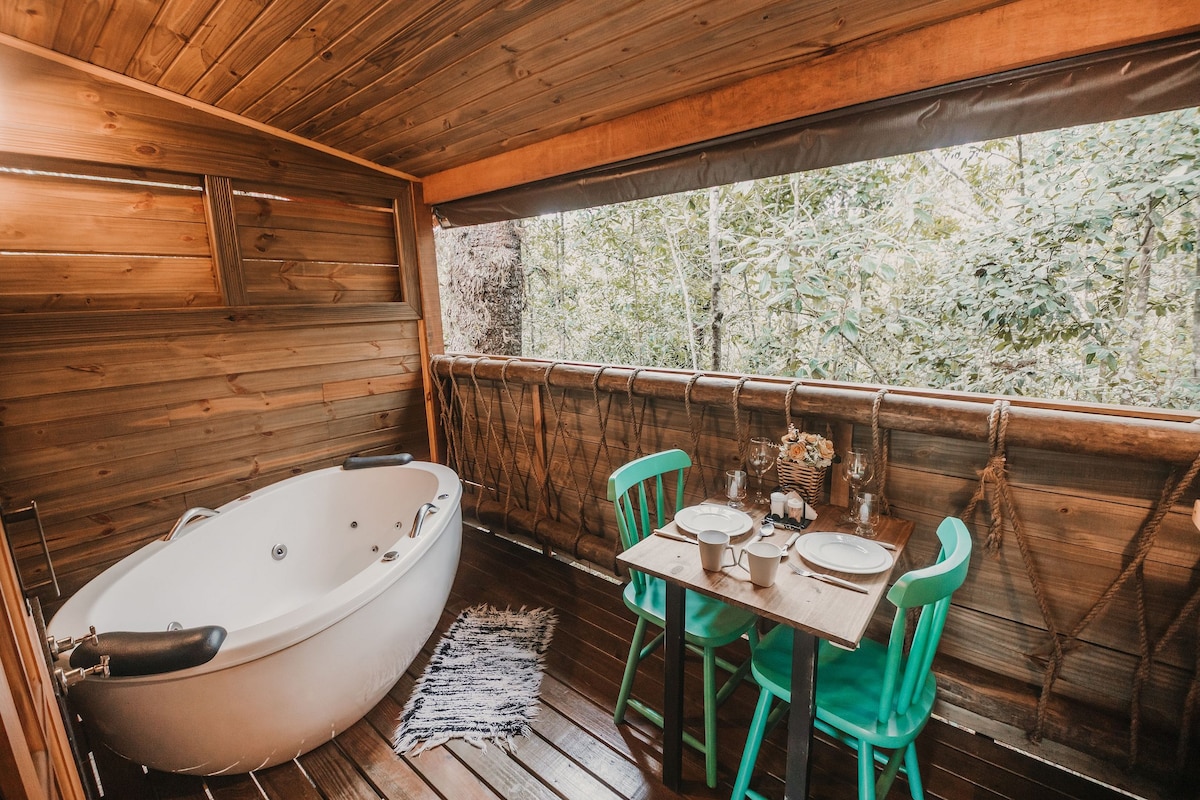 Cabaña con jacuzzi en la terraza, chimenea eléctrica y hermosa vista al bosque | Tema Naturaleza | Cab 2