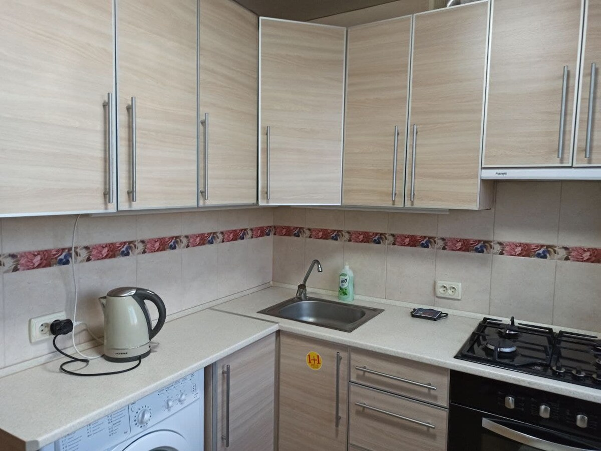 Amplio apartamento de dos habitaciones con dos dormitorios, cada uno con balcón independiente. El apartamento también cuenta con una cocina grande y separada. Hay un lugar cómodo para trabajar. La cocina con horno está totalmente equipada con todo lo necesario. Justo al lado de la casa hay un gran número de tiendas y el supermercado Silpo. El apartamento cuenta con un sistema de purificación de agua potable. Y en el fregadero hay un triturador de residuos de alimentos.