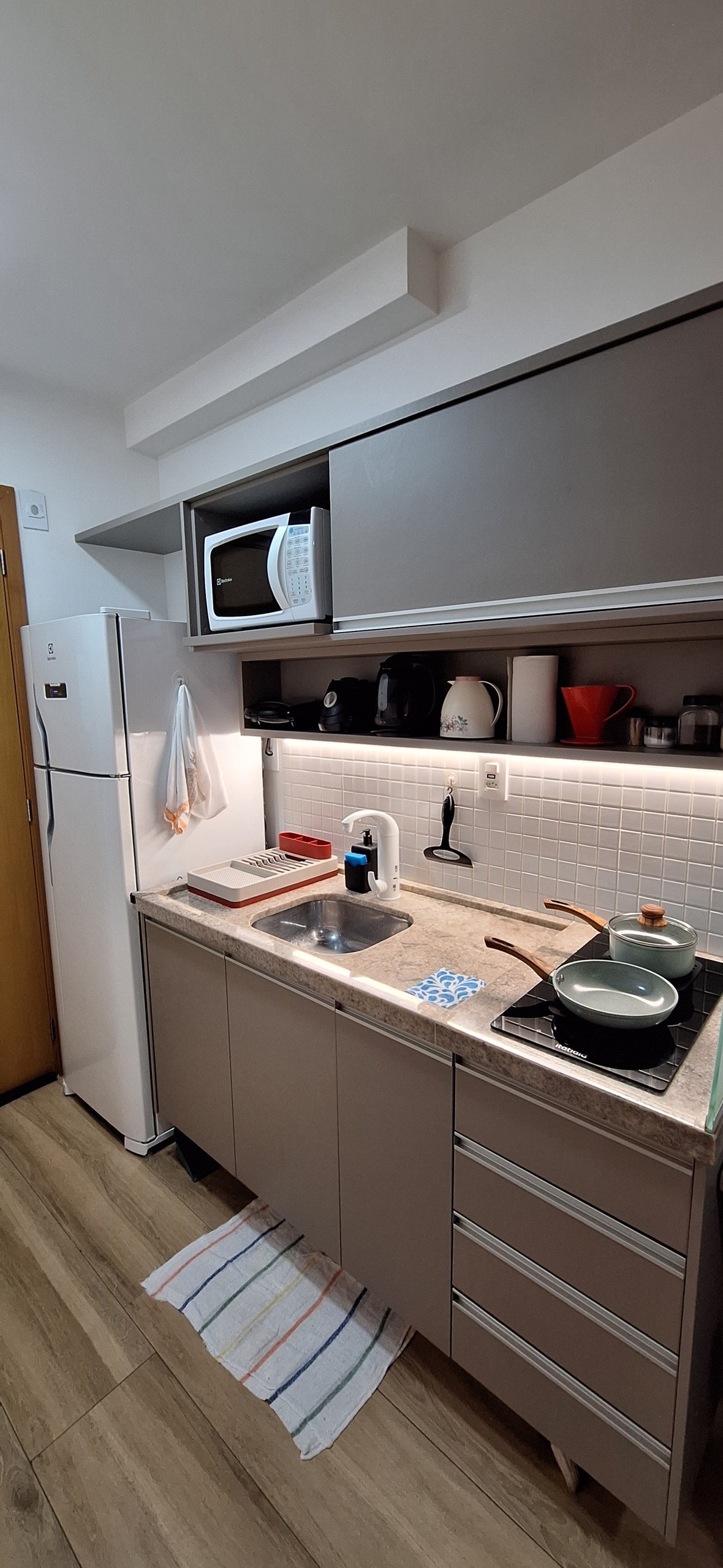 Cocina bien equipada, que incluye refrigerador, gabinetes, mesa con sillas, estufa, microondas, licuadora, freidora de aire, sandwichera, cafetera y todos los utensilios necesarios para una cocina, como ollas, cubiertos, vasos, platos... La habitación con 1 cama queen, 1 capa de espacio, 1 TV, cortina 100% opaca y 1 aire acondicionado. El baño con espejo, nichos, artículos necesarios para tu cuidado, como: cepillo de dientes, pasta de dientes, jabón, hisopo, papel higiénico y toallas corporales.