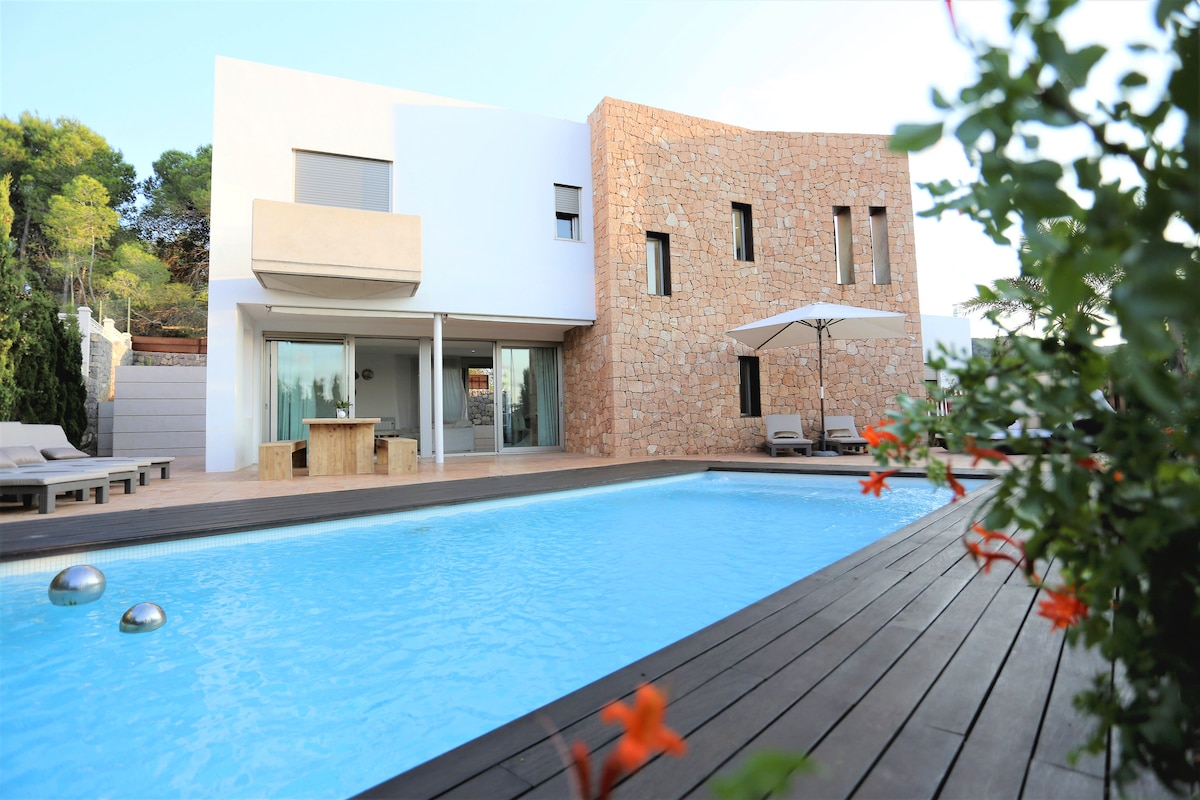 Villa de construcción moderna de 320m2 situado en un terreno de 800m2. La propiedad es luminosa y espaciosa y con un diseño minimalista y esta situada a solo 3km de la ciudad de Ibiza. Cerca del puerto, de las discotecas y de las zonas de ocio. La villa se encuentra en una zona traquila pero con vecinos y ofrece un lugar perfecto para venir con un grupo de amigos o la familia, ya que tiene habitaciones grandes y muchas zonas diferentes para disfrutar. No se admiten fiestas de ningun tipo.