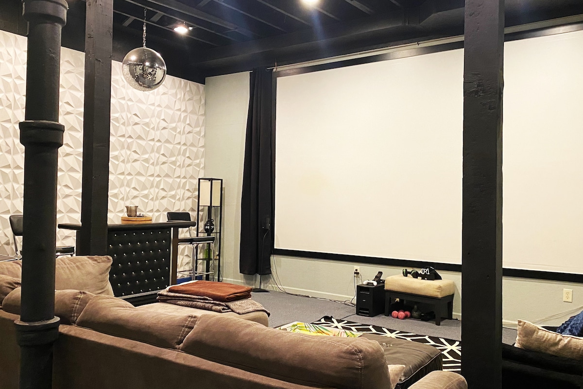 ¡Envíame un mensaje para obtener descuentos de temporada y militares! Las comodidades incluyen: - Cine privado con sonido envolvente - Jacuzzi relajante para 6 personas - Chimenea al aire libre. - Barra de café y té - Dormitorios temáticos - Cocina totalmente equipada. - Aparcamiento gratuito - Heladería a poca distancia a pie - Parque infantil portátil opcional. - Zona de estar y asientos al aire libre - Mesa de fuego. - Barbacoa Weber. - Acceso a Drake. - Cerca de bares y restaurantes. - A menos de 6 minutos en coche del centro de la ciudad.