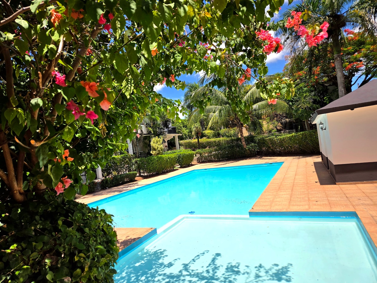 Amplio condominio con amplia sala de estar interior con sofá cama, mesa de comedor para 4 personas y cocina bien equipada. Balcones con mesa de comedor para 6 personas, 2 tumbonas y un segundo balcón sombreado con 2 sillas y una mesa pequeña. Habitation con cama king y cortinas blackout y abanico. El condominio está ubicado en lo más alto, lo que lo hace muy privado y tiene una vista de 180 grados del exuberante jardín tropical y el Océano Atlántico. Gran piscina comunitaria y seguridad 24h.
