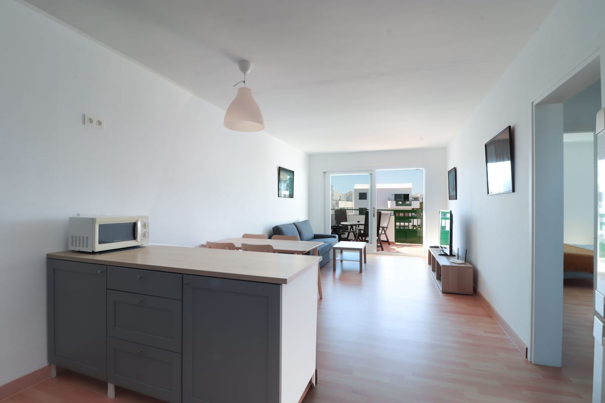 Amplio y luminoso apartamento recién reformado y amueblado en complejo totalmente renovado con piscina comunitaria. Este lujoso apartamento es ideal por su ubicación, en una tranquila calle con gran zona de aparcamiento gratuita, en pleno centro, junto al Pueblo Marinero. A solo un minuto de la playa de Las Cucharas y zona comercial. El apartamento consta de una luminosa cocina abierta con salón-comedor, dos amplios dormitorios y dos baños. Terraza independiente con acceso directo a la piscina.
