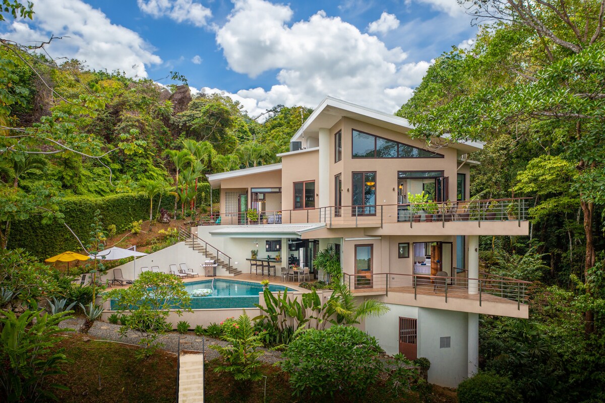 Disfruta de este retiro en las colinas de Dominical. La relajación y la diversión son bienvenidas, la música alta y las fiestas no lo son. Rodeado de crestas montañosas y selva, te esperan comodidades modernas y vistas al mar desde la piscina privada. Dependiendo de la época del año, hay muchos animales que ver, como monos, perezosos, loros, tucanes, lagartos y mucho más. Ten en cuenta que no está en Dominical, sino a 2,8 km por una carretera de montaña desde la playa de Dominicalito. Se requiere un vehículo 4x4 para acceder a la propiedad.