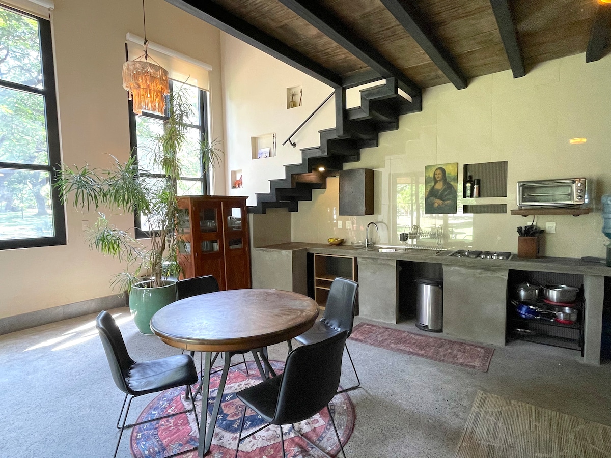 Hospédese en un loft moderno en Big Sky Stables, a las afueras de San Juan del Sur, con fácil acceso desde la nueva autopista costera en Escamequita. Despiértese con el sonido de los monos aulladores y los caballos pastando. Disfrute de su café matutino en su patio privado con vista a los establos. El loft cuenta con aire acondicionado, agua caliente y Wi-Fi estable. Camine hasta las canchas de pickleball y los restaurantes locales, o diríjase a las playas cercanas en cuestión de minutos. Como huésped, le ofrecemos paseos a caballo con descuento. Esperamos tu visita pronto.