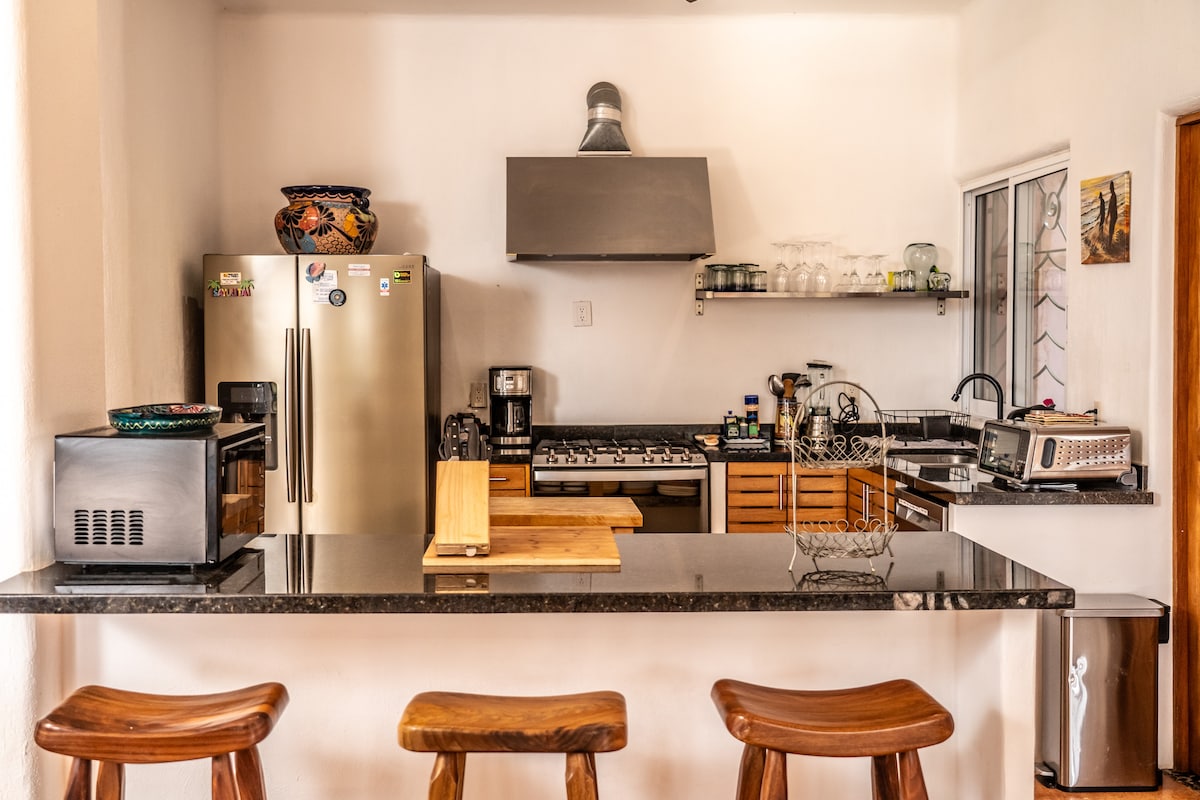 Crea recuerdos inolvidables en este lugar único y familiar. Este hogar lejos de casa, tiene una cocina totalmente equipada, 3 dormitorios, 3 baños, con aire acondicionado moderno, techo de 12 pies con ventiladores modernos en cada habitación, una pequeña piscina de inmersión (fresca), terraza en la azotea y un patio con palapas. Se encuentra justo en la calle principal, cerca de tiendas de conveniencia, restaurantes, tiendas y farmacias. A 10 minutos a pie de la playa para impresionantes atardeceres y amaneceres. O salta a las olas para practicar surf.