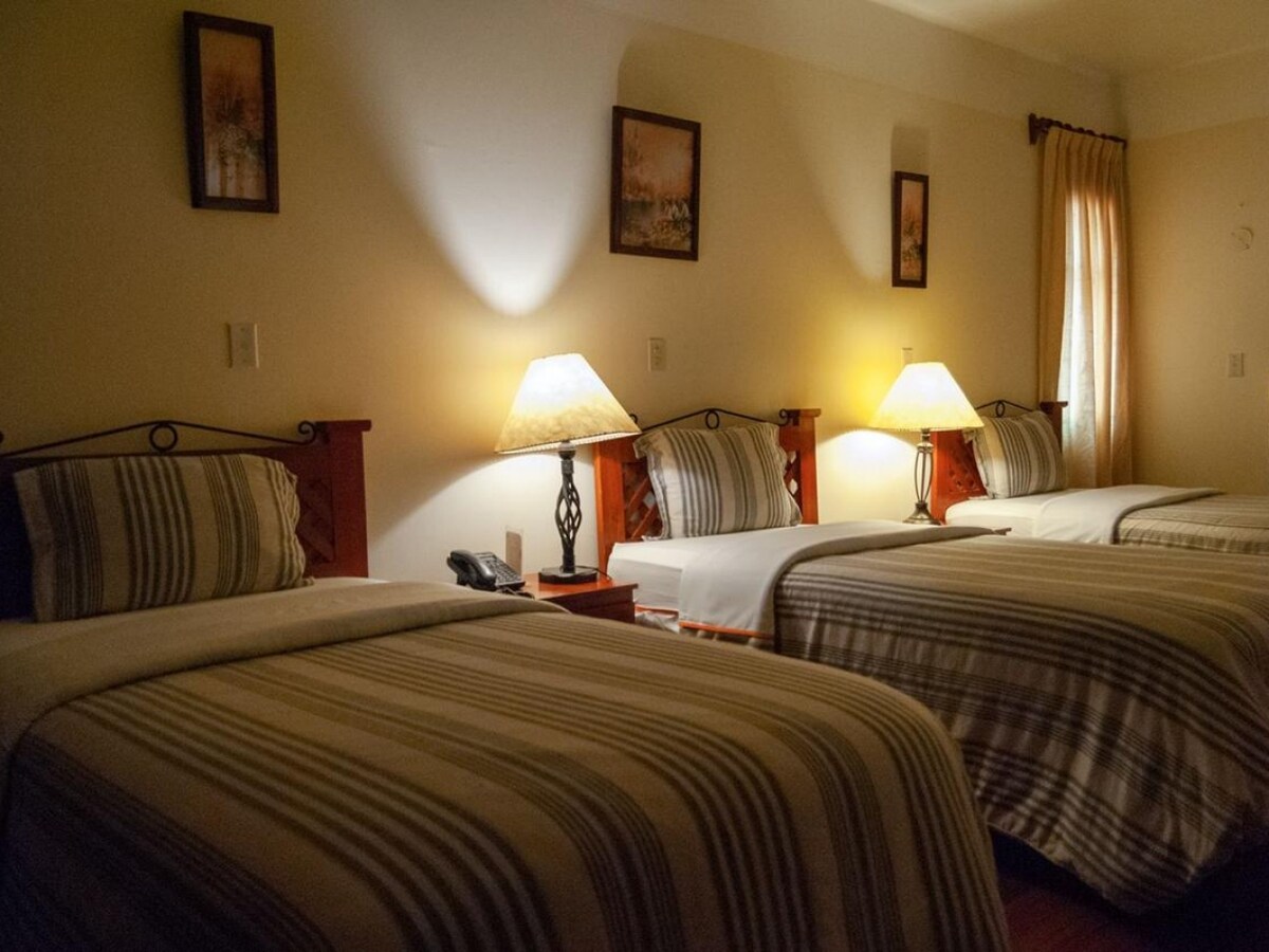 Habitación Matrimonial cama de 2 plazas, baño propio con ducha agua caliente, jabón y shampoo, ubicada en el segundo piso vista a la ciudad. Smart Tv 55" Samsung 4K Crystal. Toallas de cuerpo, mano y pies, cortinas de tul y blackout, almohadas, almohadones y cojines en la cama. Wifi alta velocidad en todo el Hotel.