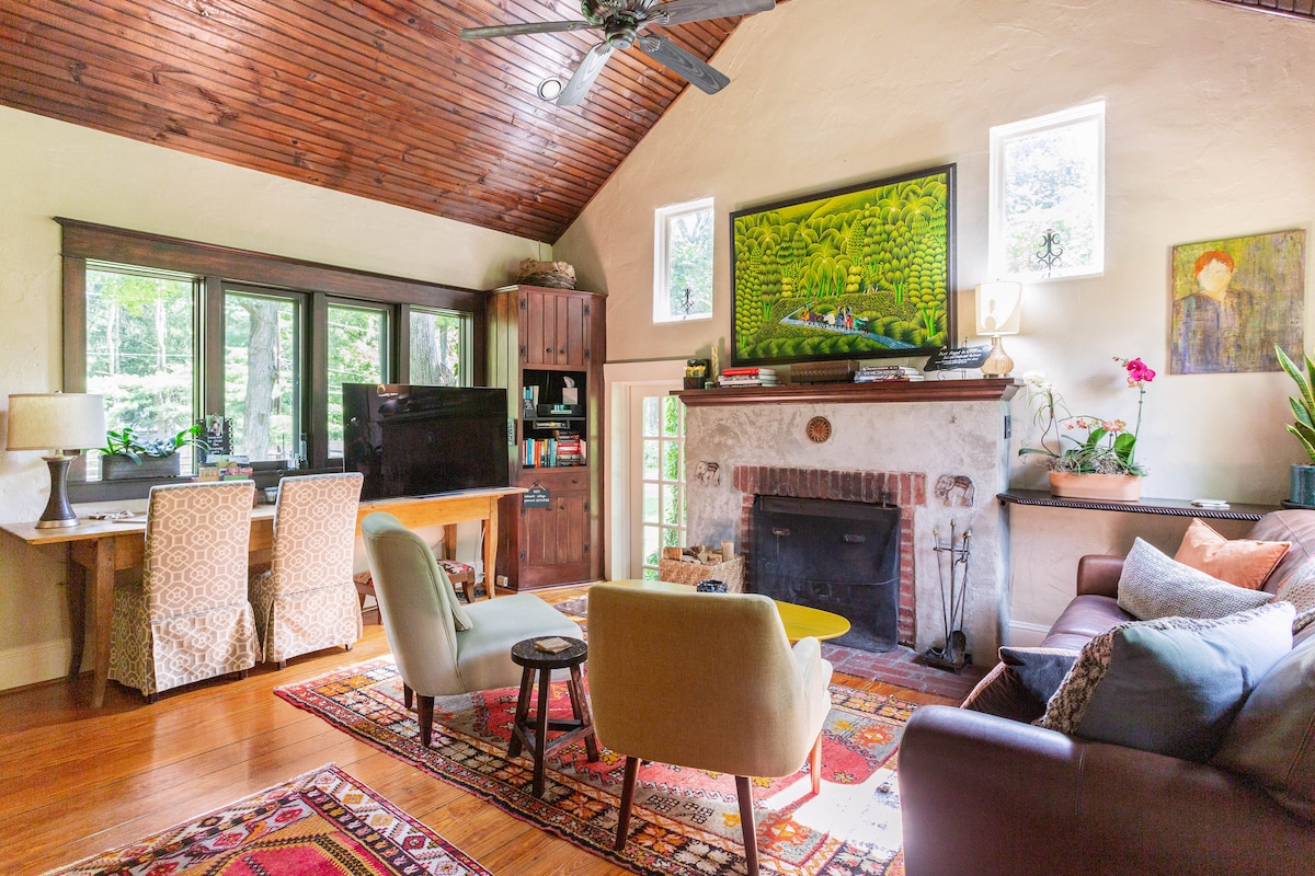 Ubicado en el corazón de Frenchtown Nueva Jersey, encontrarás encanto escondido en los exuberantes jardines de River Witch Cottage. • Recupérate en una lujosa cama tamaño queen. • Prepara una comida sencilla en la cocina totalmente equipada • Nutrete en el encanto de un comedor íntimo • Reclínate con comodidad junto a una hermosa chimenea de gas • Rejuvenece en los chorros de la bañera de hidromasaje, sumergiéndote bajo el resplandor natural de los tragaluces • Tómate un café por la mañana o un vino por la noche en el tranquilo entorno del patio privado al aire libre.