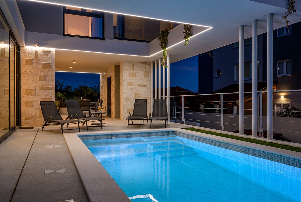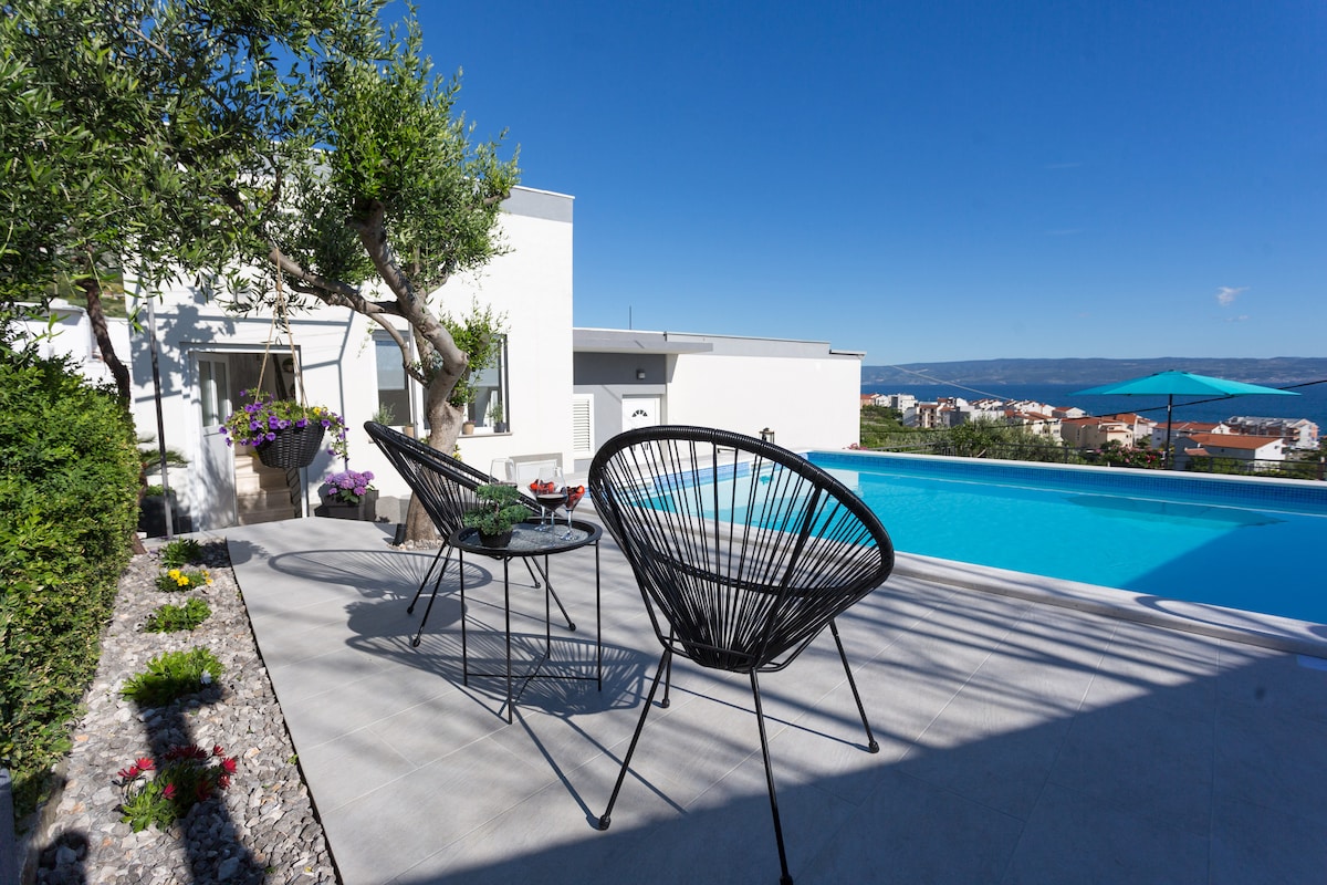 Set in a small touristic place Podstrana, located between Split and Omiš, Luxury Residence Elais is an extraordinary luxury resort with all the modern comforts to spend vacations full of fun and relaxation. It can accommodate up to 10 persons. It offers a PRIVATE heated swimming pool with whirlpool, sunbathing area and a multipurpose terrain, summer kitchen with BBQ, outdoor dining area and firepit, playroom, a library, a cinema room, a SPA and a gym.