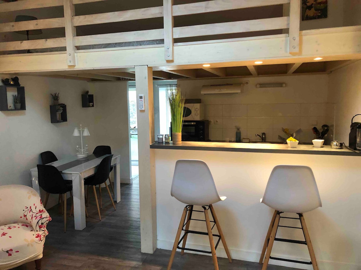 Centro de Poitiers, a 5 minutos andando de la plaza Notre Dame, del rectorado, IAE y de las calles peatonales, con aire acondicionado, independiente al fondo de nuestro jardín. Terraza privada. Aparcamiento de pago en la calle o aparcamiento del teatro a 8 minutos a pie. (Tarifa en el sitio web del aparcamiento) 2 a 4 personas: una cama doble en la habitación principal y una cama doble en el altillo (no apta para niños pequeños) Lavadora. Wifi (fibra) Entrada independiente por el garaje. No se permiten fiestas ni veladas, no se admiten animales.