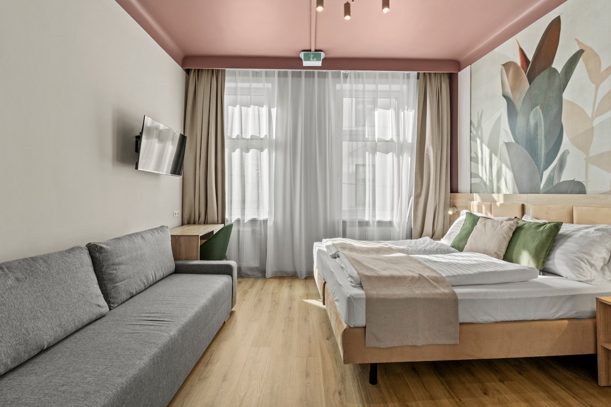 Perfecto para dos amigos: nuestras habitaciones medianas ofrecen camas individuales, vistas a la ciudad y espacio adicional para relajarse. Algunos incluso tienen dos camas individuales, ideales para amigos o familiares. ¿Te apetece disparar aros? Cada habitación cuenta con un baloncesto Max Brown y un aro. El séptimo distrito de Viena (Neubau) es conocido por su ambiente moderno, artístico y vibrante. Es un punto de interés para creativos, jóvenes profesionales y amantes de la cultura, que ofrece una mezcla de boutiques, cafeterías independientes y vida nocturna.