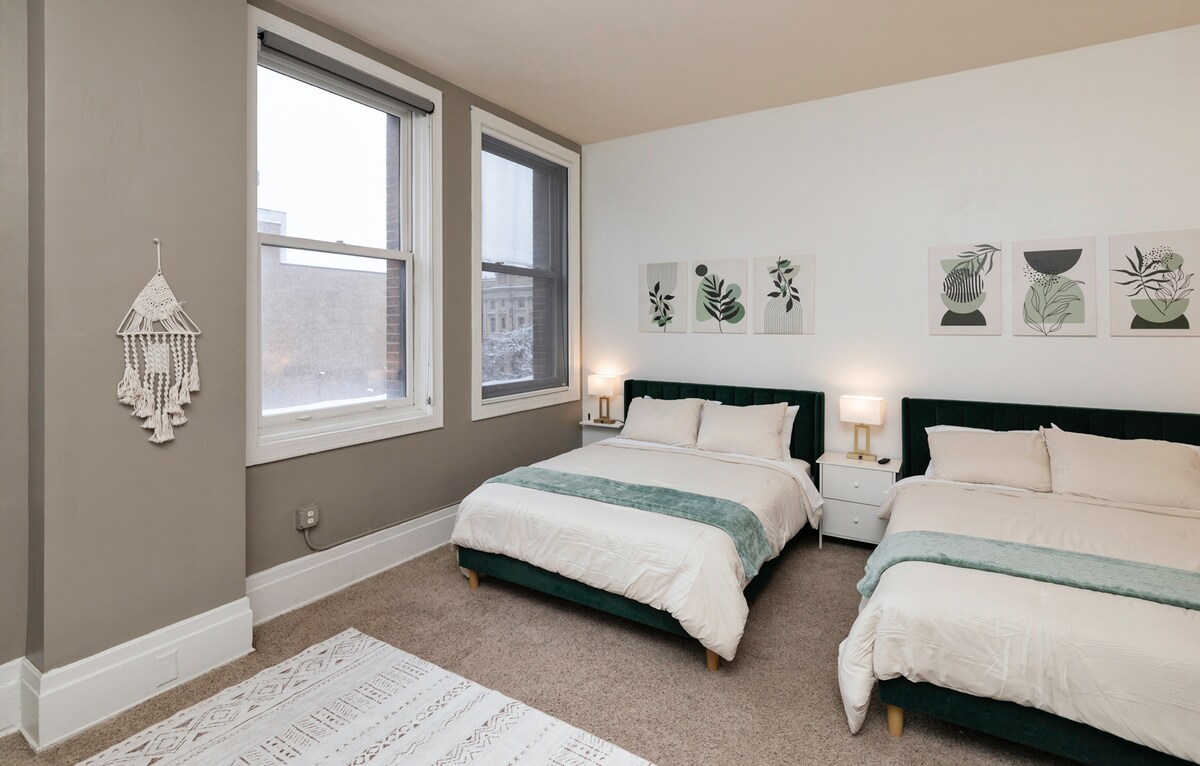 Disfruta de nuestra escapada a la pantalla plateada, que cuenta con una sala de cine, cocina completa y un dormitorio con 2 reinas y una litera, todo en una unidad. Además, al otro lado del pasillo, descubre un apartamento estudio separado con 2 camas tamaño queen más, una cocina completa y una ducha cómoda para una experiencia integral. > TU PROPIA SALA DE CINE > 2 unidades en una. Duerme de 10 a 12 personas > Centro central: a 3 cuadras de Court Ave. > 2 cocinas completas > 4 camas tamaño queen y una litera > Ideal para eventos > Wifi en ambas unidades > Café gratis