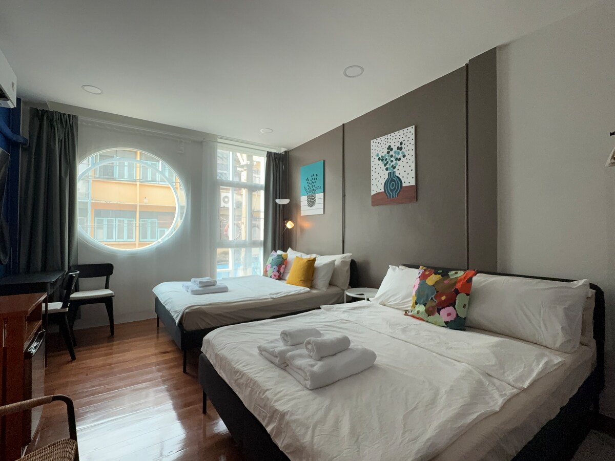 Una habitación compacta y económica para 4 personas en el 4º piso (*SIN ASCENSOR*) de una casa adosada ubicada en el CORAZÓN DE BANGKOK. A solo 400 metros de BTS Phayathai y Ratchathewi, moverse es muy fácil. Rodeado de tiendas locales, restaurantes y tiendas de comestibles, nunca tendrás que preocuparte por la comida. ¿Quieres ir de compras? El mercado de Pratunam, Siam Paragon, Siam Square, MBK Center, Centralworld y Big C Ratchadamri están a solo 1-2 paradas de BTS o a 10-15 minutos a pie, el sueño de un adicto a las compras hecho realidad.