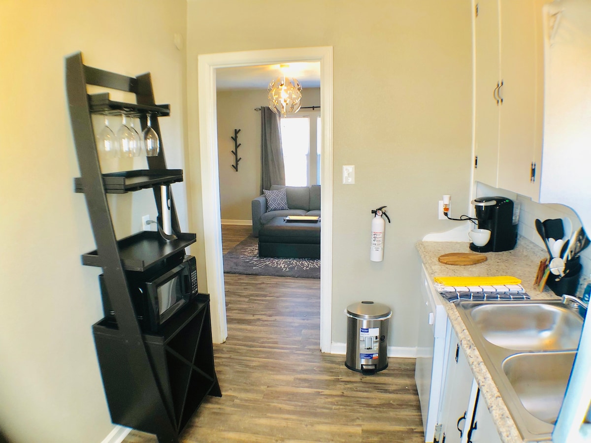 Disfruta de una experiencia elegante en este lugar céntrico. ¡A 0,4 millas del centro! - Capacidad para 4 personas. Características: - 1 dormitorio con cama tamaño queen Serta, -1 sofá cama tamaño queen en el salón. - Lavadora/secadora, - Cafetería - TV inteligente de 65 pulgadas en el salón - Televisor inteligente de 45 pulgadas en el dormitorio. - Cortinas opacas en el dormitorio. * ¡Casa totalmente equipada y recién remodelada!