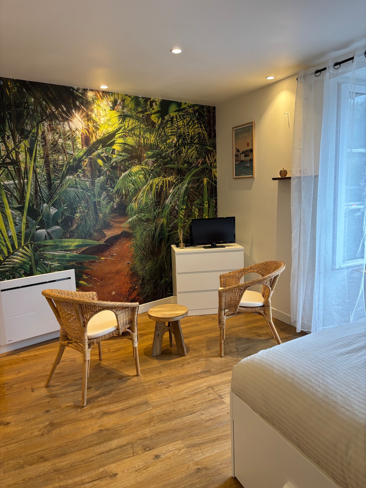 A Pont l'abbé, les commerces à pied, à 200m du GR34, appartement dans une partie indépendante de ma maison. L'entrée se fait par une porte située à l'arrière, vous serez entièrement autonome. Il se compose d'une chambre avec un lit 140, une baignoire et un lavabo, une seconde pièce avec un clic-clac, un frigo, une plaque de cuisson, un micro-ondes, cafetière classique et nespresso, bouilloire et le nécessaire de cuisine(pas d’évier) et une tv (chromecast)
