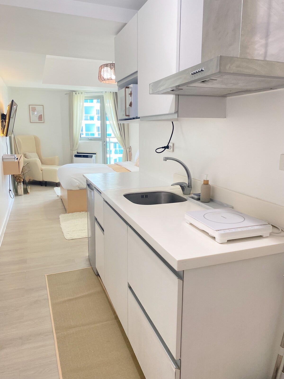 Staycation in Pampanga for only P2500/night 🏝Man-made Beach and wave pool 🌊 ⛰Spacious balcony - Mount Arayat view 🔅Minimalist Interior with extra bed Can accommodate max 4 person Studio unit with extra bed