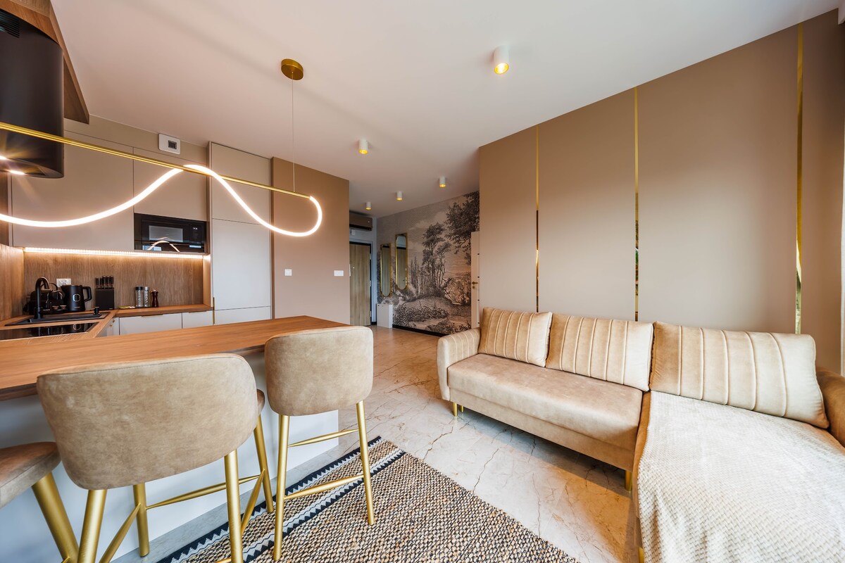 Apartamento de lujo con una superficie de 45 m²: - Cocina totalmente equipada con electrodomésticos Gorenje y Samsung de primera clase. - Un salón con un cómodo sofá, un televisor moderno y unas vistas increíbles de la ciudad. - Un hermoso baño con bañera y ducha. - Dormitorio de estilo con una cama grande y cómoda.