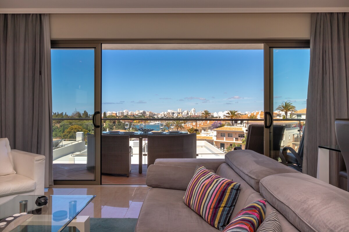 Nuestro apartamento con vista al mar es un impresionante refugio que combina la elegancia moderna con la belleza natural. Lo más destacado de la sala de estar de planta abierta es una pared de vidrio, que ofrece vistas panorámicas que se extienden desde las distantes montañas de Monchique hasta el vibrante puerto deportivo y el reluciente océano, una vista que se siente como una obra de arte viva.