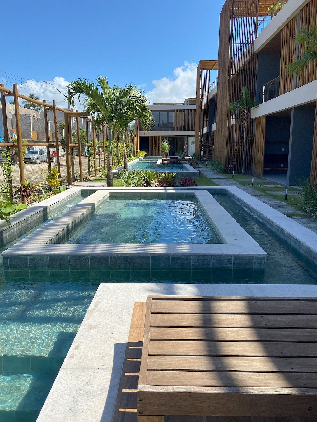 Descubre el encanto de la Ruta dos Milagres alojándote en nuestro sofisticado estudio, a solo 2-3 minutos en coche del paradisíaco Praia do Patacho. Ubicado en el condominio del centro vacacional Villas Manatee, el espacio ofrece una vista increíble de la piscina, uniendo el encanto y la comodidad en un solo lugar. También tendrás acceso a un condominio con gimnasio, piscina, jacuzzis, parque infantil y seguridad las 24 horas. ¡Estamos cerca de mercados, restaurantes y las bellezas naturales de Miracles!