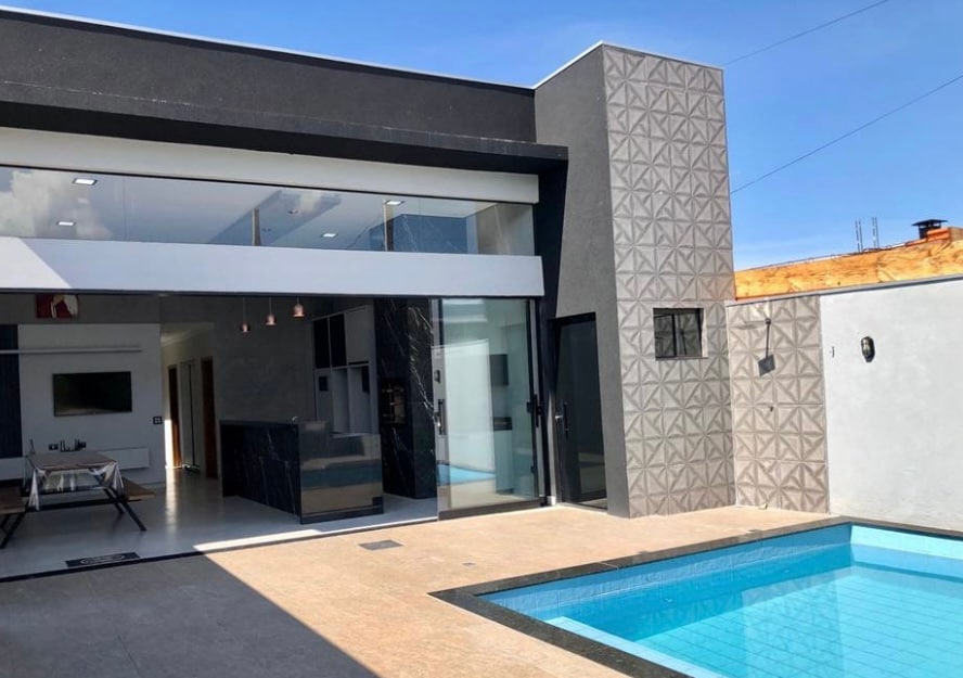 Hermosa casa con piscina y zona gourmet con todos los accesorios, aire acondicionado en todas las habitaciones y ducha con calefacción a gas. La casa tiene una hermosa piscina con cascada, terraza de madera y un gran sistema de sonido tanto para la zona de la piscina como para la zona gourmet.