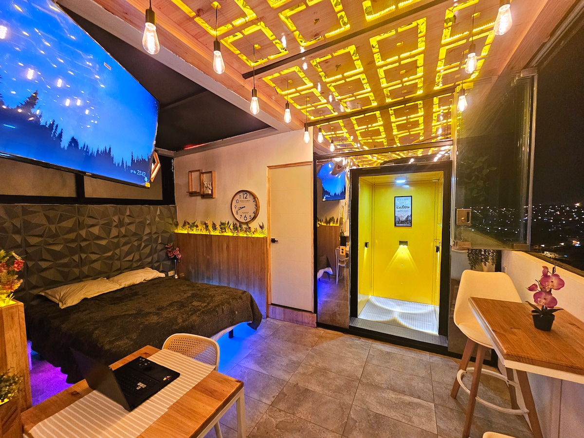 Disfruta de vistas espectaculares e inigualables a los volcanes desde el balcón en este moderno estudio. El apartamento esta esta 100% equipado con amenidades de alta calidad. Desde una cama queen y un sofá cama, hasta una cocina totalmente equipada y cortinas blackout. Incluye un espacio de estacionamiento, acceso al gimnasio y a la tienda de conveniencia del edificio. A solo 8 minutos del aeropuerto, es el lugar perfecto para ti