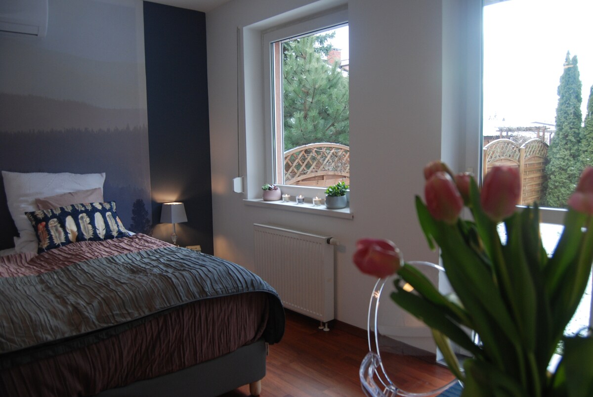 Moderno apartamento de 1 dormitorio con aire acondicionado y una decoración interesante. El baño tiene una cabaña sin escalones y un bidé. Cocina totalmente equipada: nevera, lavavajillas, microondas y fogones. La habitación tiene una televisión y camas muy cómodas. Una ventaja adicional es la salida al jardín. El apartamento está situado en el centro de la ciudad, muy cerca de tiendas y transporte público. Cerca hay un lago, un bosque y una piscina.