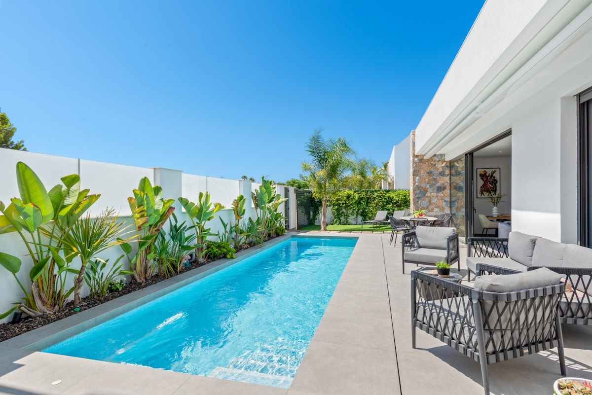 Villa de lujo para 6 personas con piscina privada climatizada cerca del mar. Todo lo que necesitas para unas vacaciones inolvidables en la Costa Cálida (España). 3 elegantes habitaciones con camas de matrimonio. Dos baños de lujo. Piscina privada climatizada (9 metros) con spa y sistema de contracorriente. A poca distancia a pie y en bicicleta de la playa, el paseo marítimo y acogedores bares y restaurantes